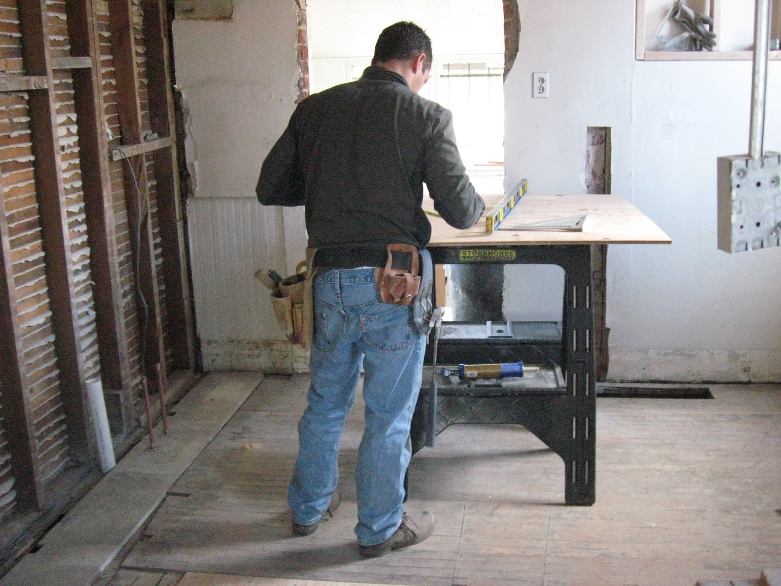 We also removed the wood floors from the downstairs bathroom for patching by our flooring expert. The wood slats are unique dimensions and would be very expensive to recreate today. The good slats had to be carefully removed, nails pulled, and stashed away for safe keeping. After warming up the wood working skills we moved onto to 88 degree corners. While patching the floor in the kitchen we discovered that not all walls are created equal, or with the use of a square. This just adds to the charm of an old home. Basically, we did the prep work for the flooring expert to make his job faster and cheaper.